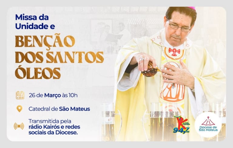 Junte-se a nós para a Missa da Unidade e Benção dos Santos Óleos, um momento sagrado de renovação e fortalecimento espiritual. Participe conosco no dia 26/03, às 10h, na Catedral de São