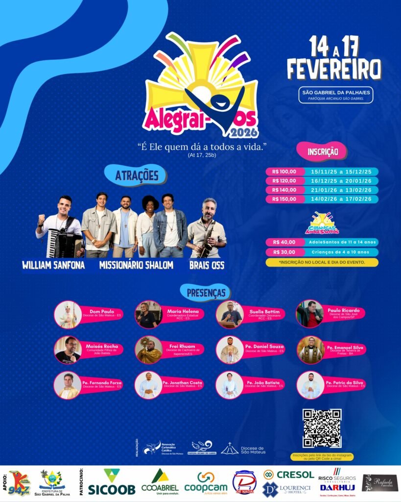 As inscrições seguem abertas, com valores escalonados conforme o período de inscrição, e podem ser realizadas por meio do link disponível na bio do Instagram @diocesedesaomateus ou pelo QR Code divulgado nos materiais oficiais do evento. Também será possível realizar a inscrição no local, no dia do evento.