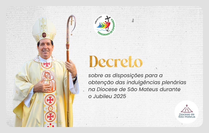 Movidos pela solicitude pastoral para com o Povo de Deus e em conformidade com o Decreto “Sobre a concessão da indulgência durante o Jubileu Ordinário do ano 2025 proclamado por Sua Santidade o Papa Francisco”, emanado em Roma, no 13 de maio de 2024 pelo Tribunal da Penitenciaria Apostólica – Tribunal da Misericórdia, por Mandato de Sua Santidade, o Papa Francisco –, PROCLAMAMOS SOLENEMENTE as DISPOSIÇÕES para a obtenção das INDULGÊNCIAS PLENÁRIAS, na DIOCESE DE SÃO MATEUS, por ocasião das Celebrações Jubilares dos 2025 anos do nascimento de Jesus Cristo, nosso Salvador.