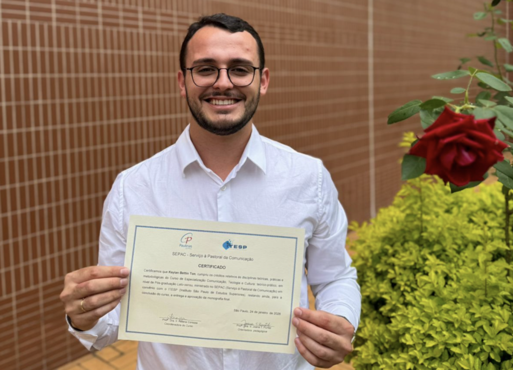 A comunicação como instrumento de evangelização e serviço à Igreja tem assumido papel cada vez mais relevante na formação pastoral. Nesse contexto, o seminarista Kaylan Bettim Ton concluiu a Pós-Graduação em Educação, Pastoral e Mediação Cultural, oferecida pelo Serviço à Pastoral da Comunicação (SEPAC), em parceria com o Instituto Teológico de São Paulo (ITESP).
